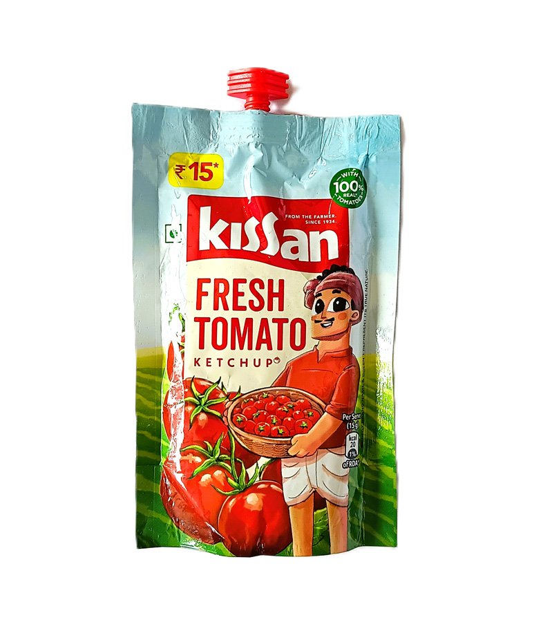 Kissan Tomato Ketchup is a popular Indian condiment known for its sweet, tangy, and spicy balance, made with real tomatoes