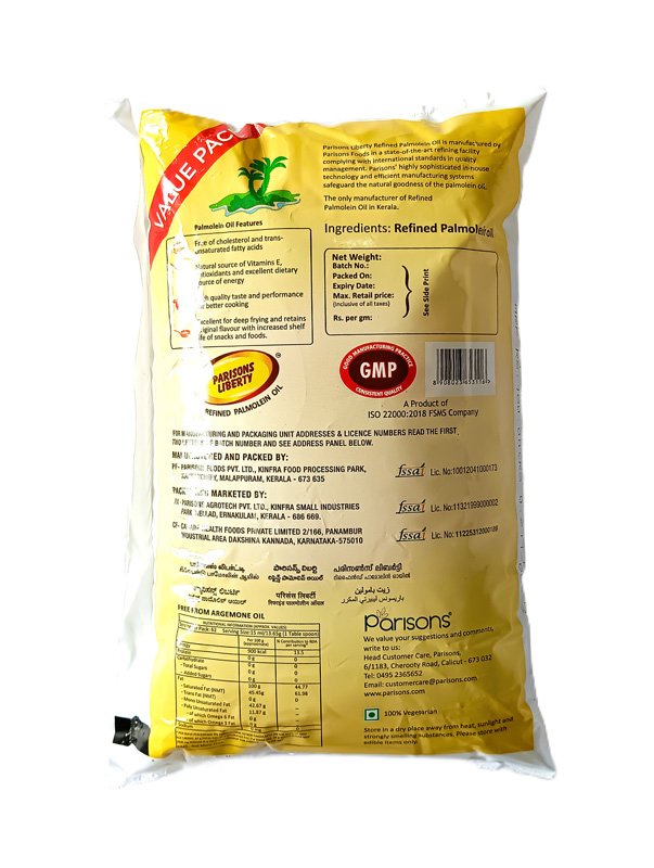 PARISONS LIBERTY PALMOLEIN OIL is a refined, cholesterol-free cooking oil from the Parisons brand, prized for its stability, high smoke point, and suitability for deep frying and various food manufacturing applications.